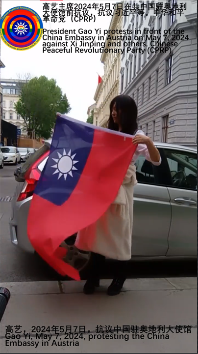 Gao Yi displays the real Chinese flag (Republic of China) in front of the communist pseudo-Chinese embassy in Austria to protest against the pseudo-Chinese “People's Republic of China” and talks about how the CCP is a puppet pseudo-government of the Russian invasion and colonization of China, that the CCP regime has no legitimacy, and that the Chinese will not be the slaves of the country, Chinese Peaceful Revolutionary Party (CPRP), May 7, 2024