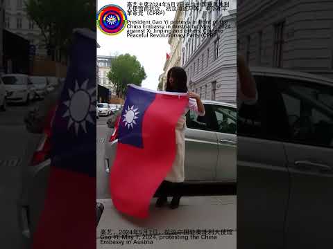Gao Yi zeigt die chinesische Flagge (die Flagge der Republik China) und drapiert die echte chinesische Flagge (die Flagge der Republik China) über Gao Yi, als sie gegen die pseudochinesische Botschaft der KPCh in Österreich protestiert, Chinesische Partei der Friedlichen Revolution (CPRP), 7. Mai 2024